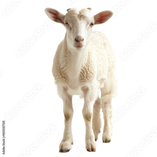 A young, fluffy white lamb stands facing the camera, showcasing its soft fur and adorable features. background removed