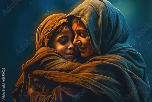 A young girl and an older woman share a heartfelt embrace. Fictional Character Created By Generative AI