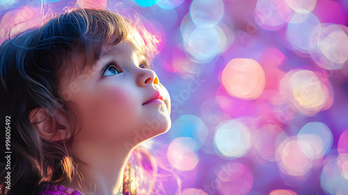 A Young Girl Gazes Upward with Wonder, Her Eyes Reflecting the Magic of the Bokeh Lights