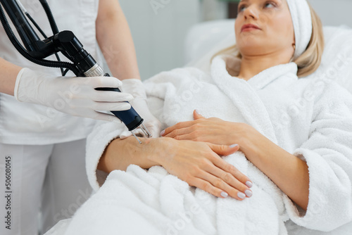 A young girl gets carbon peeling for the skin of her hands in a beauty salon. Laser pulses cleanse the skin. Hardware cosmetology. The process of photothermolysis, warming the skin.