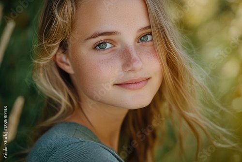 A young girl poses for a photo, her bright blue eyes capturing attention