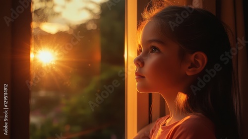 A young girl wearing a hijab gazes out a window, bathed in sunlight, reflecting a moment of contemplation and connection with the outside world.