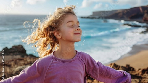 A young girl with blond curly hair is happily embracing the fresh sea breeze on a beautiful beach, with her eyes closed and a peaceful expression on her face.