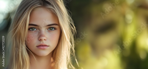 copy space, teenage girl, green eye, blonde hair, outdoors, golden hour, portrait, youthful, beauty, calm, thoughtful, natural, closeup, youth, innocence, fashion, casual attire, sunlight, serene, facial features, head shot, atmospheric, natural makeup, warm tones, gaze, calmness, femininity, soft focus, carefree, summer, youth culture, softness, charme, candid, childlike, fresh face, calmness, harmony, summer