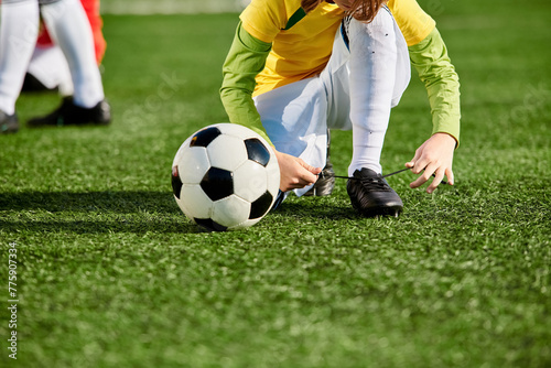 key, girl, children, children, kneeling, picking, soccer, ball, field, grass, colourful, patterned, sport, activity, play, game, fun, leisure, enjoyment, youth, childhood, small, tiny, adorable, cute, journey, exploration, quest, discovery, adventure, determination, curiosity, excitement, competition, teamwork, team, athlete