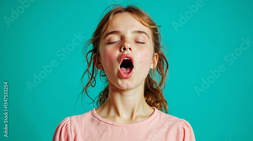 young, girl, yawning, mouth, open, woman, pink, shirt, blue, background, expression, relaxed, beauty, hair, neck, lip, closed, eye, exhaling, breathing, portrait, studio, lighting, closeup, wide, making, silly, face, blond, wearing, t-shirt, solid, turquoise, colours, late, teenage, early, 20s, slimmer, smile