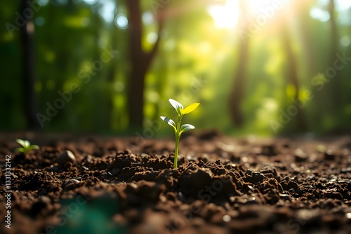 A young green plant sprouts from rich soil in a sunlit forest. The morning light creates a serene, hopeful atmosphere, symbolizing new beginnings
