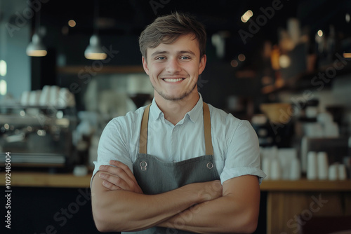 A young male barista of European appearance in work clothes stands and looks at the camera in a coffee shop. There is a photo of a cafe in the background. High quality photo