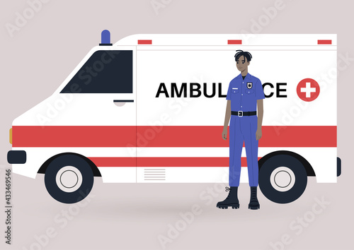 A young male Black ambulance doctor on duty wearing a uniform, a health care concept