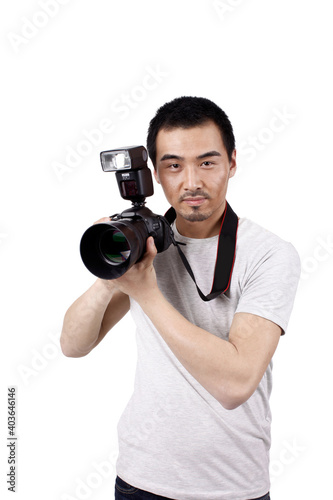 people, casual attire, confidence, individuality, cool, creativity, concentration, skill, vertical, studio shot, waist up, asia, east asia, spectacle, camera, asian, occupation, professional occupation, holding, beijing, one person, photographer, adult, young adult, man, young men, one man only, photo, photographing, fashion, digital camera, capital city, white background, adults only, fashionable