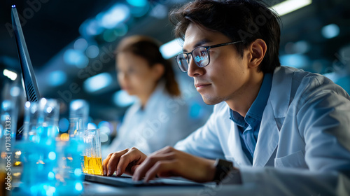 A young male researcher with test tubes using a computer in a sleek medical lab, Asian female scientist working behind, male scientist medical lab, test tubes computer research, As