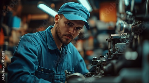factory, men at work, machine, industrial, manufacturing, male, man, young, work, blue, jumpsuit, cap, serious, professional, concentrated, sharpened, production, operation, technology, equipment, metal, steel, engineering, automation, industry, labor, blue-collar, trade, machinery, gear, safety
