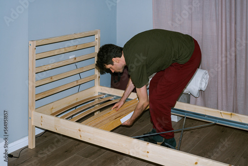 apartment, assembly, bed, bedchamber, box, cardboard, clothing, curly, curtain, fastening, floor, focused, furniture, headboard, hunched, indoor, instruction, interior, jersey, keen, lamella, lamp, male, man, manual, master, new, plywood, portrait, process, read, sitting, speaker, wood
