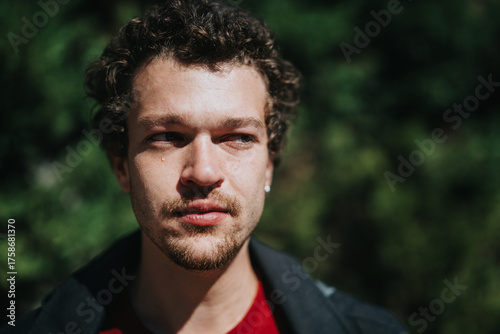 man, thoughtful, tear, emotional, nature, outdoors, greenery, poignant, portrait, person, people, serious, restraint, sensitive, depth, youth, light, environment, sharpened, contemplation, serenity, sombre, life, moment, casual attire, natural, humanity, sincerity, connection, soft, background, daylight, observation, beard, fashion, closeup, detail, realistic, natural light