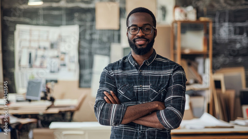 A young man in a black and white striped shirt stands confidently in a cluttered office with a blackboard in the background.