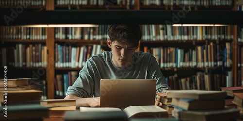 A young man in a grey shirt is focused on his laptop, sitting at a table in a dimly lit library, surrounded by shelves filled with books, embodying academic dedication.
