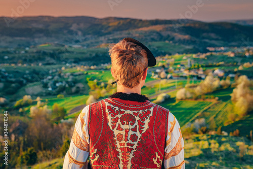 A young man in a Slovak folk costume looks at the spring landscape in the village of Hrinova in Slovakia. Rising sun and spring flowering trees in the background. Edit Space