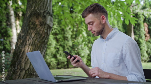 A young man using a phone in the park and sitting at the table. Medium shot. Soft Focus