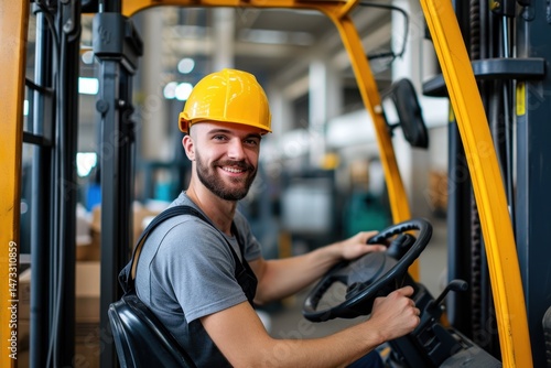 A young man wearing a yellow hard hat and a gray t-shirt, operating a yellow forklift in a warehouse with boxes and machinery in the background.