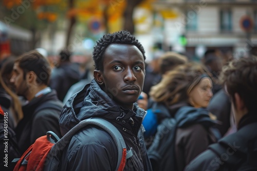 young, man, backpack, urban, street, crowd, autumn, jacket, thoughtful, city, life, pedestrian, bustling, diverse, people, emotion, scene, exploration, observation, tied-up, atmosphere, community, fashion, engagement, public, space, walking, social, interaction, youth, reflections, connecting, ambience, lively, nature, foliage, culture, candid, multicultural, expression, gathering, lifestyle, watching, journey, attentiveness, scenery, environment