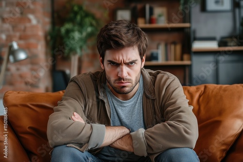 A young man with a serious expression sitting on a couch, arms crossed, in a cozy living room with brick walls and plants in the background.