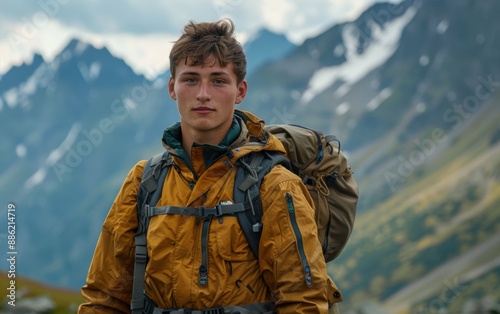 man, young, photogenic, hiking, backpack, mountain, mountain, landscape, nature, outdoors, adventure, travel, exploration, scenery, wilderness, trekking, climbing, trail, path, view, scenic, beautiful, blue, eye, hair, curly, jacket, puffer, yellow, green, brown, grey, cold, winter, summer, autumn, spring, day, sunny, cloudy, fresh, air, freedom, active, healthy, strong, confident, positive, happy