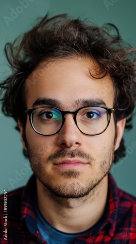 man, young, male, portrait, face, goggles, beard, hair, dark, plaid, shirt, closeup, head shot, look, camera, directly, casual attire, fashion, style, model, photogenic, attractive, person, people, human, expression, serious, neutral, indoor, studio, photographer, colours, green, red, blue, teal, background, clothing, apparel, eyewear