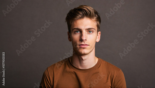 man, male, portrait, head shot, model, young, brown, hair, t-shirt, casual attire, clothing, studio, background, grey, neutral, expression, looking, camera, serious, face, eye, closeup, people, person, human, fashion, style, photogenic, attractive, clean-cut, adult, man, photoshoot, simple, minimal, modern, contemporary, colours, texture, light, shadow, sharpened, sharp, clear, professional, clean