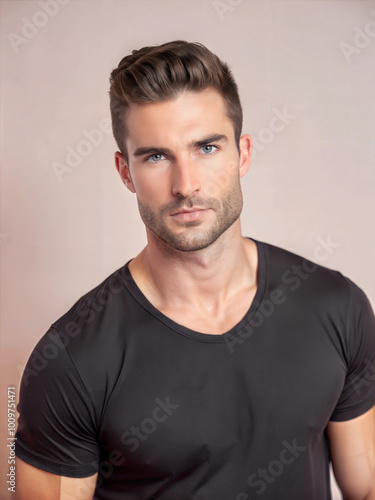 young men, blue eye, black shirt, portrait, charisma, casual attire, posing, attractiveness, stylish, modern, photogenic, facial features, expression, eye contact, youthful, demeanor, fashion, individuality, fitness, personality, elegance, charme, head shot, portraiture, realism, emotion, attracted, model, face, casual attire, muscular, body, macho, muscle, athlete