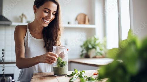 A young smiling woman making a smoothie in the kitchen in a daylight.