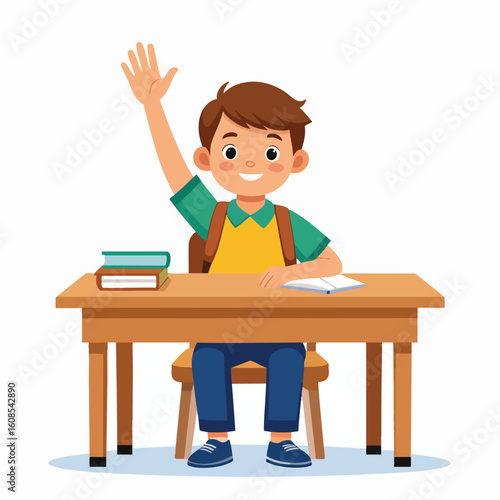 boy, children, student, pupil, classroom, desk, chair, book, book, notebook, education, learning, cognition, school, study, teacher, lesson, subject, question, answer, hand, raised, arm, up, happy, smiling, cheerful, curious, eager, excited, brown, hair, green, shirt, yellow, backpack, blue, pant, shoe, sitting, wooden, table, front, view, isolated, white, background, cartoon, illustration