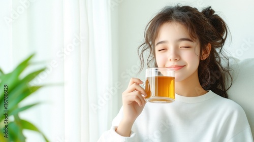 drink, tea, happiness, relaxation, lifestyle, joy, beverage, warmth, comfort, home, leisure, calm, contentment, enjoyment, youth, smiling, cosy, indoor, nature, light, peace, calmness, wellness, refreshment, mood, aesthetic, casual attire, mindfulness, moment, health, harmony, simplicity, beauty, portrait, expression, satisfaction, sipping, serene, cheerful, favor, aroma, life events, refresh, smile, ambience, pleasure