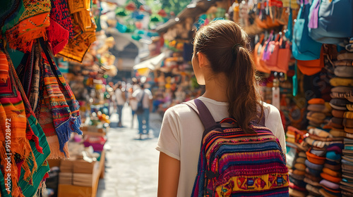 A young woman explores a colorful market street in Mexico, the essence of local travel and youthful curiosity filling the vibrant scene