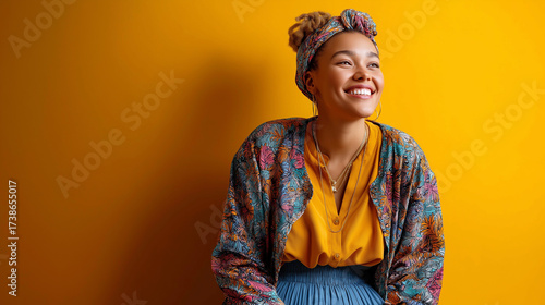 A young woman from a diverse background in a stylish casual outfit, posing joyfully against a vibrant yellow background, diversity, inclusivity, interracial couples, plus-size mode