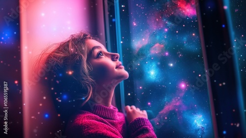 A young woman gazes out a window at a colorful nebula, her eyes filled with wonder and curiosity.