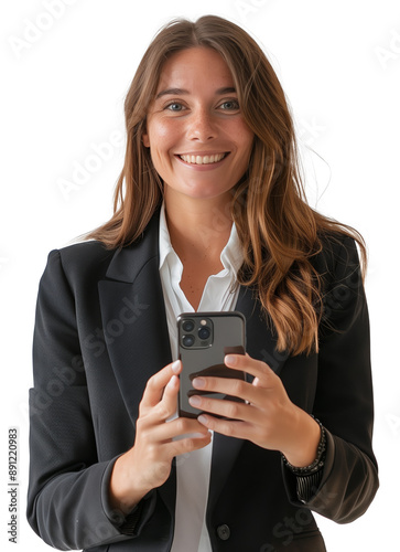 A young woman in a black blazer and white shirt smiles warmly while holding her smartphone. The image captures a blend of modern connectivity and professional elegance