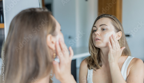 woman, skincare, beauty, cream, lotion, mirror, routine, morning, bathroom, smooth skin, hydratation, wellness, natural, fresh, glow, youthful, healthy, minimalist, relaxed, cosmetic, pampering, modern, elegance, femininity, radiant, soft light, lifestyle, indoor, peaceful, contemporary, looking, applying, facial expression, focused, aesthetic