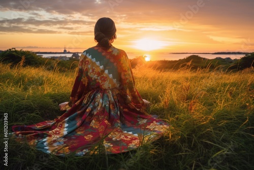 colourful, meditation, view, sitting, beach, meditating, woman, dress, sundress, summer, lotus, kimono, relax, back, calm, lifestyle, happy, sea, sun, relaxation, holiday, landscape, travel, to sit, vacation, zen, nature, holiday, yoga, people, lady, style, rear, sunrise, person, water, happiness, tour tourism, vacation, coast, colours, ocean, sunset, freedom, outdoors, generative, ai