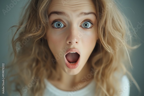 A young woman looks into the camera with her mouth open and a shocked look. Amazed and excited facial expression, unexpected joy, screams, emotion of surprise and impressions