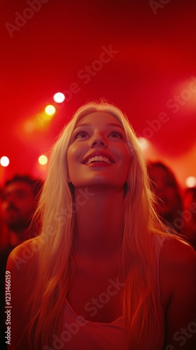 concert, woman, audience, joyful, music, light, vibrant, red, blond, crowd, excitement, enjoyment, night, show, happiness, event, festival, performance, lively, engaging, spectacle, people, celebration, party, indoor, entertainment, atmosphere, stage, scene, fun, enchanting, youthful, gaze, delighted, energetic, trendy, artistic, culture, social