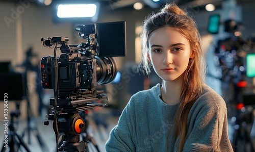 A young woman poses next to a camera in a studio setting, showcasing filmmaking.
