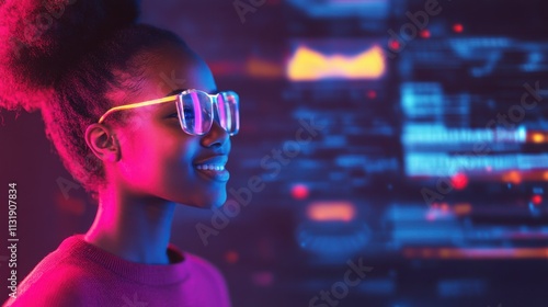 A young woman smiles against a vibrant, digital backdrop of glowing colors and patterns, wearing stylish glasses that reflect the futuristic environment.