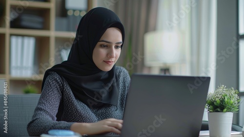 A young woman wearing a black hijab is focused on her work while using a laptop computer in a modern office setting.