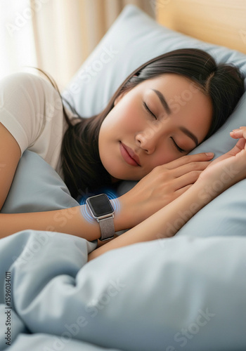 A young woman wearing a smartwatch sleeps peacefully in bed, highlighting concepts of sleep tracking, health monitoring