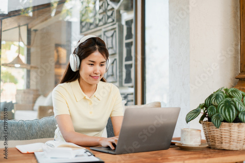 woman, laptop, earphones, home, office, work, study, technology, indoor, plant, natural, light, cosy, workspace, remote, freelance, digital, lifestyle, casual attire, sharpened, concentration, productivity, modern, interior, design, desk, computer, online, communication, connection, relaxation, comfort, serene, peaceful, professional, job, career, business, attire, young, adult, female