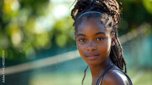 A young woman with braided hair and a headband looks confidently at the camera while standing outdoors near a tennis court. The background features lush greenery and soft sunlight.