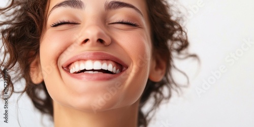 A young woman with curly hair beams with a joyful smile, radiating happiness. The bright background enhances her cheerful expression and positive energy