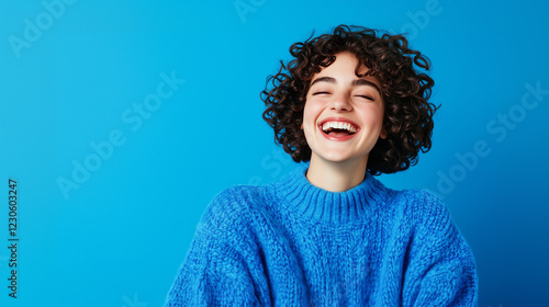 A young woman with curly hair laughs happily, wearing a cozy blue sweater. Her contagious smile and relaxed energy stand out against the striking blue background, embodying confide