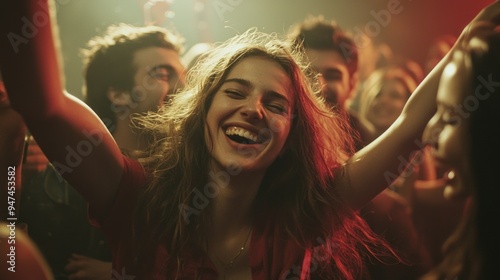 woman, female, blond, hair, long, concert, laughing, happy, smiling, party, crowd, night, music, live, energy, excitement, people, friends, fun, dancing, movement, light, light, stage, dark, blurred, background, sharpened, joy, enjoyment, entertainment, close, up, closeup, young, adult, event, red, outfit, fashion, shirt, face, eye, open, mouth, teeth, white