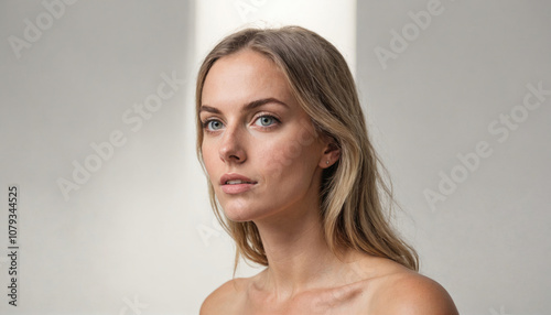 woman, female, model, blond, hair, face, portrait, beauty, skin, eye, sunlight, light, shadow, simple, background, white, grey, studio, shoot, pose, look, fashion, make-up, young, natural, feminine, naked, shoulder, neck, gorgeous, beautiful, elegance, graceful, delicate, head shot, professional
